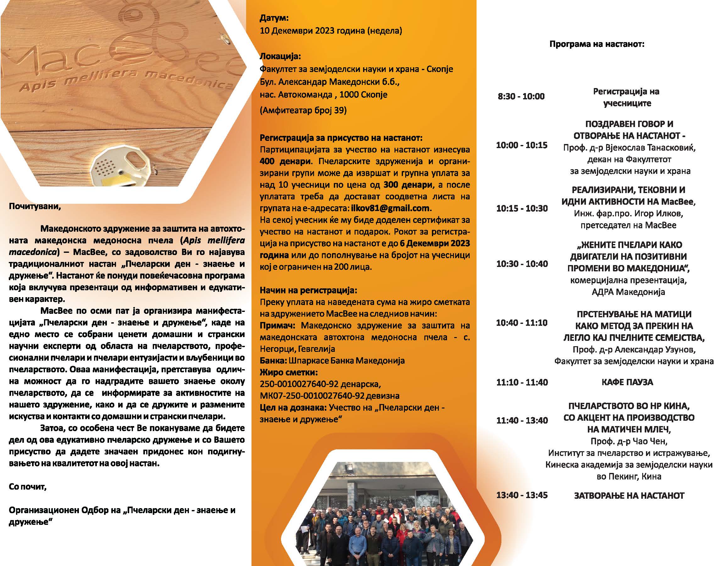 Ова е осми по ред настан кој традиционално се одржува со меѓународно учество. Оваа година, главен предавач ќе биде проф. д-р Чао Чен од Кинеската академија за земјоделски науки од Пекинг во Кина на тема „Пчеларството во Кина, со акцент на производство на матичен млеч“.